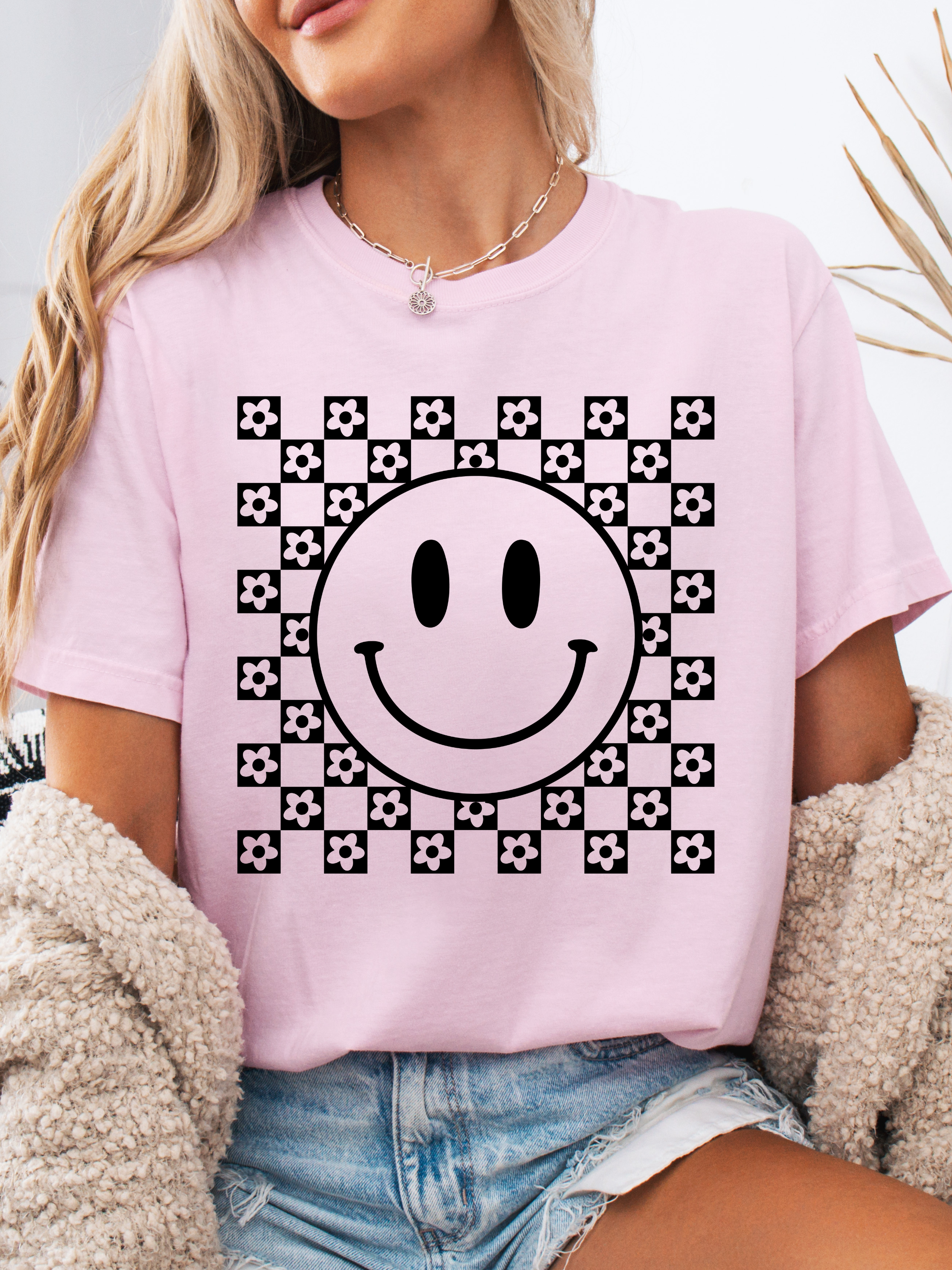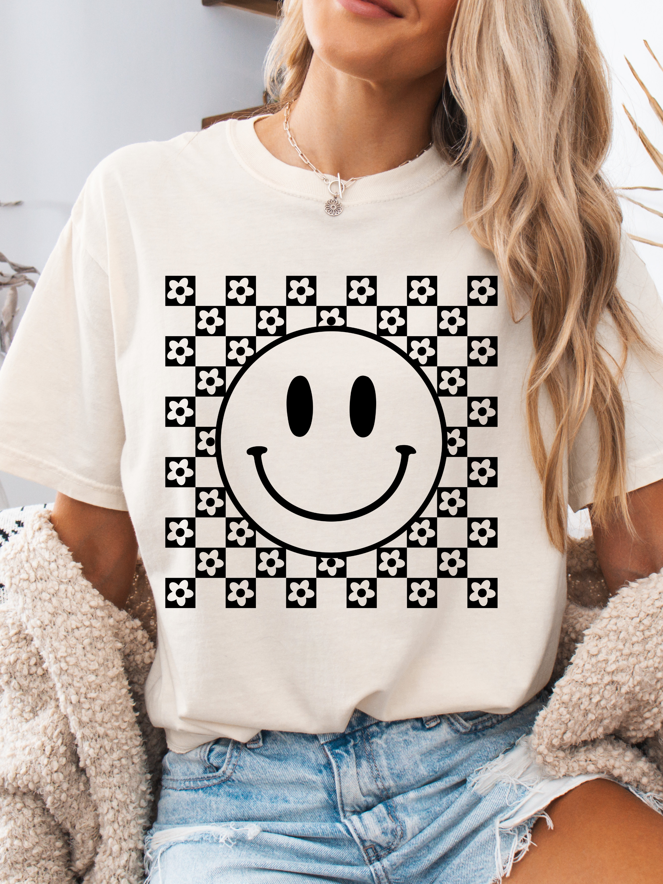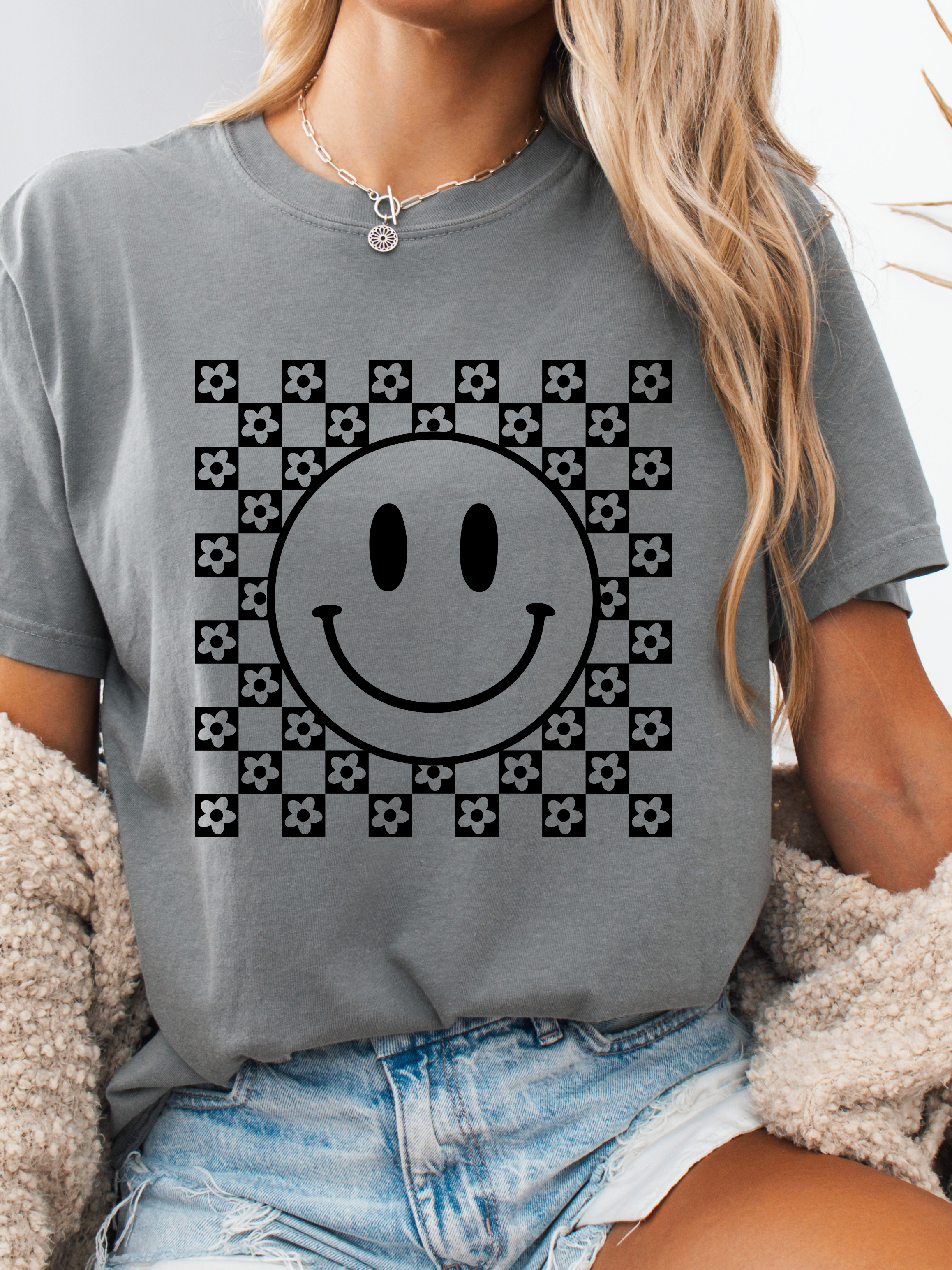 Introducing the *COMFORT COLORS BRAND* Non Distressed Checkered Smile Graphic Tee - the must-have from Willow Boutique! This tee is made from soft and cozy material, perfect for all-day comfort.