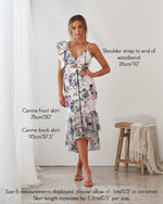 The floral lace skirt is finished with layered ruffles and matched by the asymmetrical draped sleeve.
